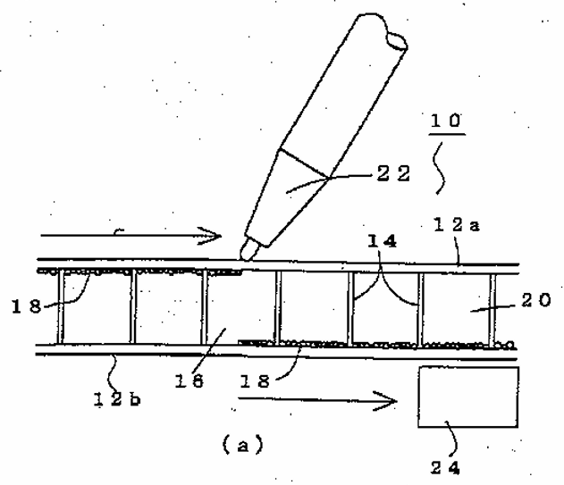・次に、非目視側パネル12b側から永久磁石24を近づけてなぞると、永久磁石24でなぞった部分の黒い磁性粒子18が非目視側パネル12b側に移動し、その結果、目視側パネル12aからは分散流体20の白色が視認される(すなわち、筆跡部分が消去されたように見える)という仕組みです。