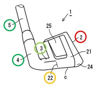 シャフト5より先にフェース部2が出ています。このことによって、パターと同じようにインパクトの瞬間のフェースが正しい方向を向いて傾かなくなり、フォローもまっすぐに延び、手首の返しも良くなります。
