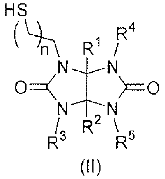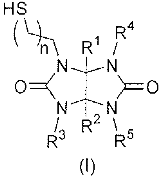 請求項1および請求項3に記載されるメルカプトアルキルグリコールウリル類として、R1及びR2が水素原子であり、nが1であり、R3、R4及びR5が2-メルカプトエチル基であるものを以下に記載します。