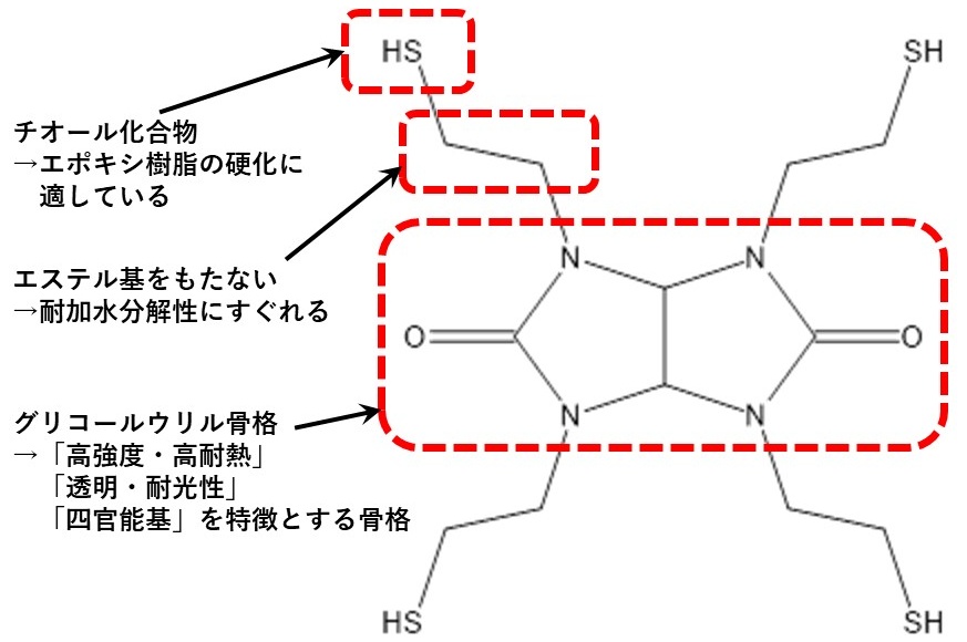 明細書の記載および硬化剤に関する一般常識等からメルカプトアルキルグリコールウリル類のそれぞれの部位の機能は以下のものであると推測されます。