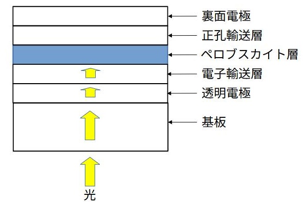 光吸収層であるペロブスカイト層を、電子輸送層と正孔輸送層で挟み、さらにそれを少なくとも一方を透明にした電極層で挟みます。