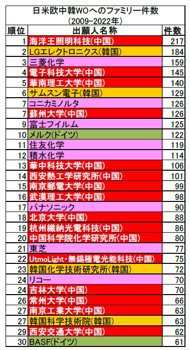 ペロブスカイト太陽電池関連の特許庁の資料[8]から、パテントファミリー(PF)件数上位出願人ランキング(2009-2022年)を抜粋します。